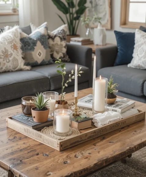 Handcrafted wooden accents like wooden trays, hand-carved bowls, or sculptural pieces can lend warmth and personality to your living room.