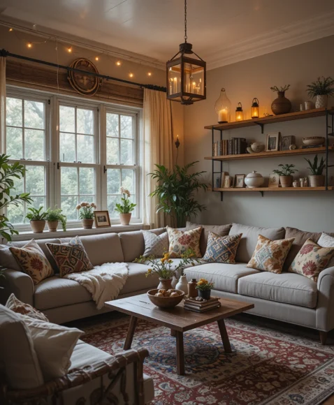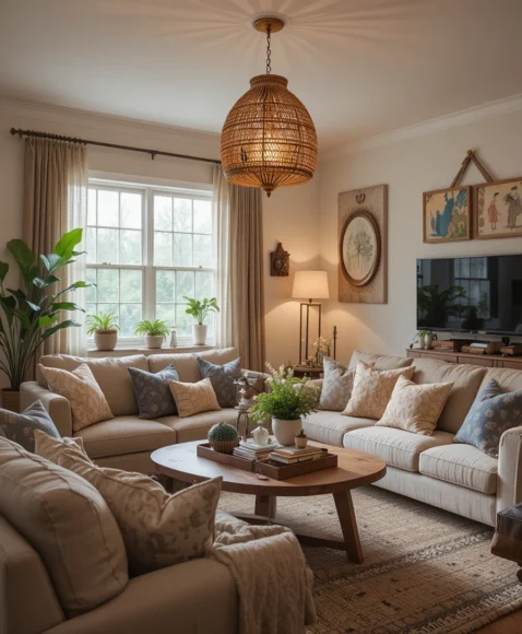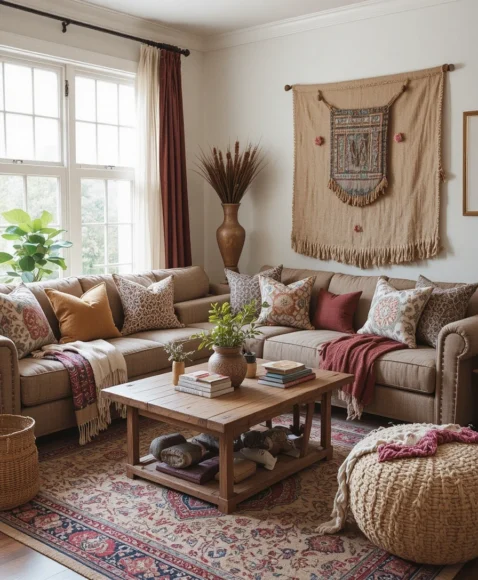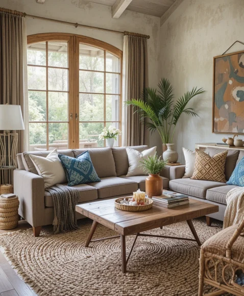 Choose pieces in earthy tones, metallic accents, and textural contrasts to add warmth and bohemian flair to the space, creating a cozy focal point in your living room.