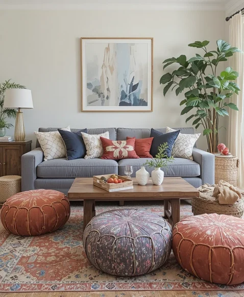 Add some chic poufs to your boho living room for both extra seating and style.