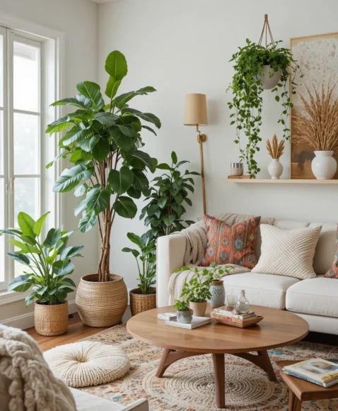 Bringing nature indoors is central to the boho aesthetic. Fill your living room with indoor plants like snake plants, sansevieria, or fiddle leaf figs to add texture and color.