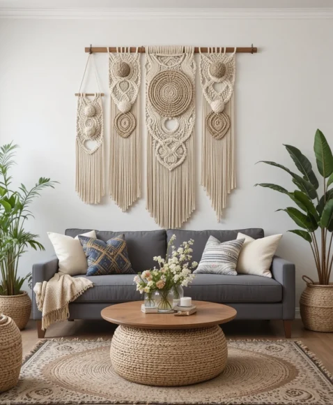 Choose from plant hangers, woven tapestries, or large wall-mounted hangings to enhance the artistic vibe of your living room.