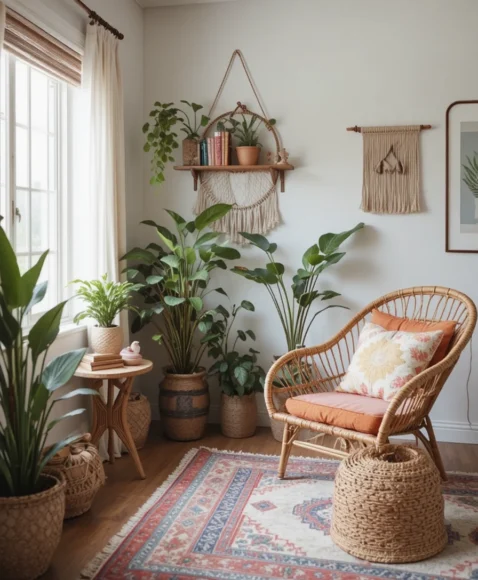 These elements bring in a tropical vibe, creating a vibrant and fresh atmosphere perfect for a summer-inspired boho space.