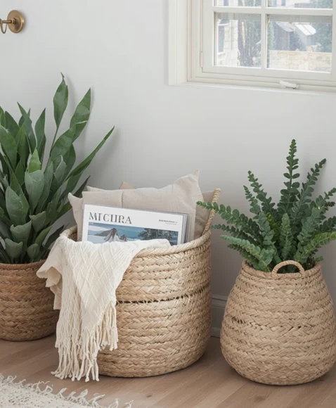 Woven baskets in various sizes can serve dual purposes: storage and decor. Use them to organize blankets, magazines, or toys while maintaining an aesthetic vibe.
