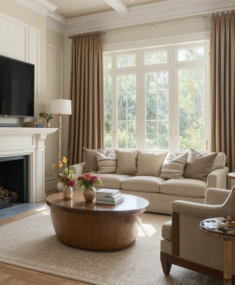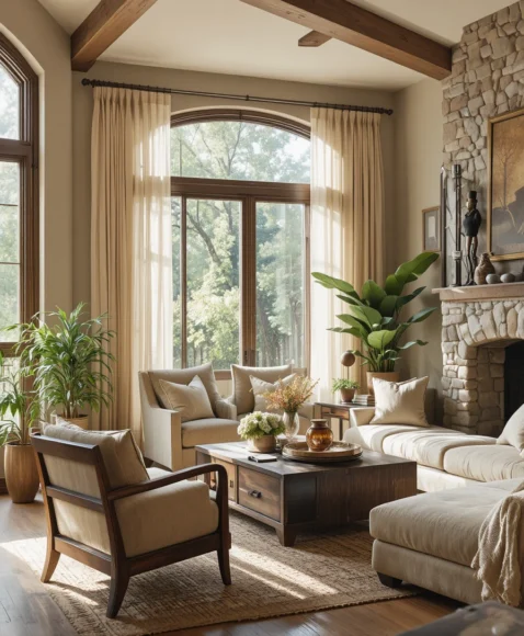 Earth-toned fabrics for curtains and furniture maintain visual cohesion. I love using shades like mocha, olive, or warm beige to harmonize the room. They enhance the natural vibe while adding soft elegance to the living space.