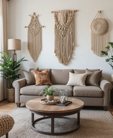 Macrame wall art adds texture and a handcrafted touch. I love how these intricate designs bring warmth and personality to the space. Hanging them above sofas or in corners enhances the natural, earthy feel while adding subtle artistic flair.