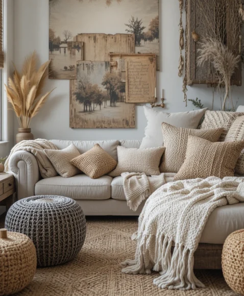 Combining textured throws, rugs, and pillows adds depth. I like mixing woven fabrics, chunky knits, and soft linens. This layering creates a tactile experience that invites relaxation and enhances the natural, earthy ambiance.