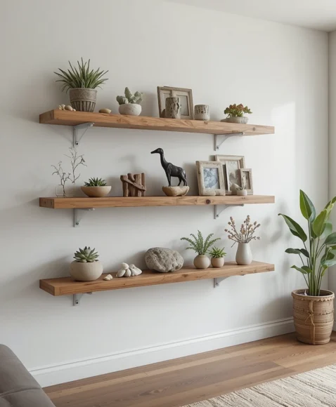 Minimalist wooden shelves adorned with natural decor like stones, small plants, and clay figurines maintain a clean yet earthy aesthetic. I love how this keeps the space organized while subtly displaying personal style and natural elements.