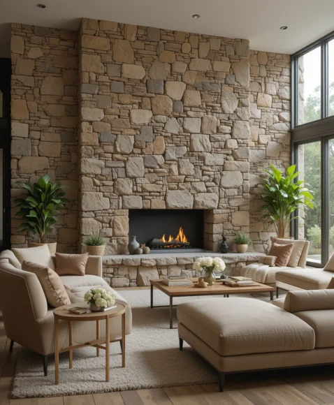 A stone accent wall brings raw, natural textures into your living space. I love how it adds depth without overwhelming the room. Pair it with minimal furniture and greenery to keep the focus on natural beauty. The earthy tones of stone make the living room feel warm, grounding, and sophisticated.