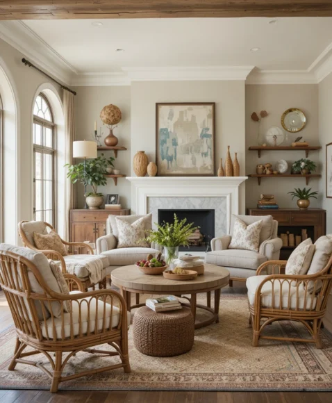 Rattan chairs, coffee tables, and shelving add a lightweight, organic feel. I enjoy mixing rattan with soft fabrics for contrast. Its natural color and texture bring warmth, while the woven details add a casual, earthy elegance to the room.