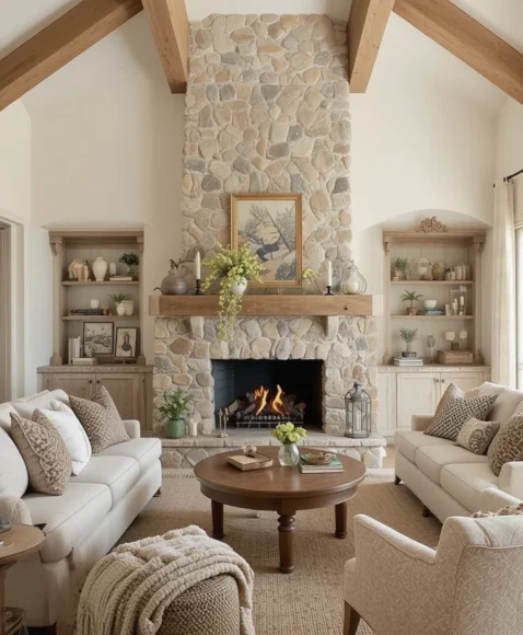 A stone or clay fireplace serves as a natural focal point. I enjoy sitting by the fireplace surrounded by soft earthy textiles. It exudes warmth and provides both visual and physical comfort, grounding the living room with rustic charm.