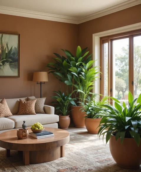 Adding terracotta planters with plants immediately transforms your living room. Greenery against warm earthy tones creates a lively, natural environment. I love how plants purify the air and add energy to the space while terracotta keeps the aesthetic grounded.