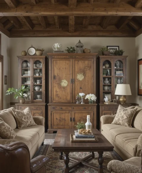 Vintage wooden cabinets bring history and personality. I enjoy their handcrafted details and warm tones, which add charm to the living room. They also provide practical storage while reinforcing the earthy theme naturally.
