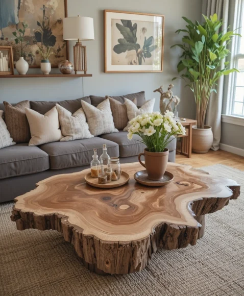 Live-edge wooden coffee tables showcase the natural beauty of timber. I love how each table feels unique with organic patterns and irregular shapes. They anchor the living room and emphasize the earthy theme effortlessly.