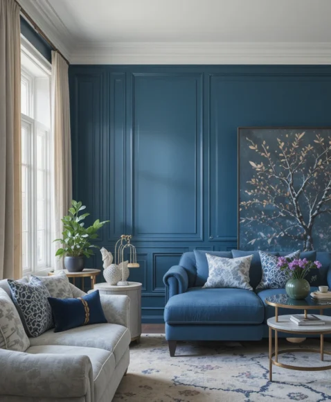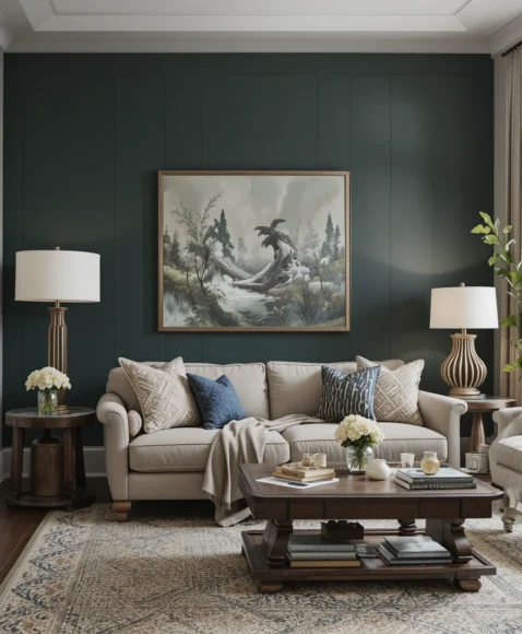 A rich, bold paint color can instantly anchor your living room. I often recommend using shades like deep navy, forest green, or charcoal because they create depth without overwhelming the room. The best part is that paint is budget-friendly and gives you complete control over the mood. A strong color also pairs beautifully with neutral furniture.