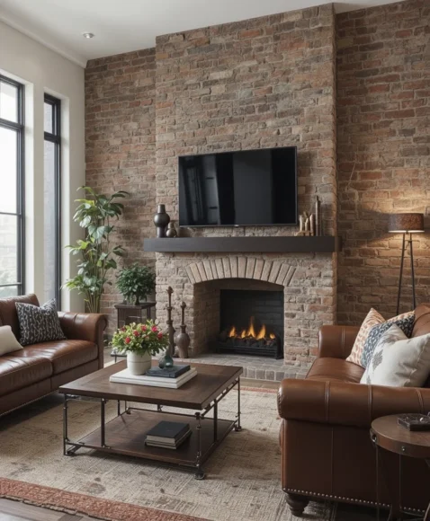 Exposed brick adds rustic charm and a hint of industrial character. Real or faux brick can both create that warm, lived-in feeling that many people love. When styled with leather furniture or metal décor, the brick wall becomes a striking focal point. This idea is perfect if you want a timeless, urban vibe.