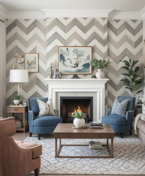 Chevron patterns add movement and a playful twist to traditional walls. They look stylish in both neutral and bold colors. I find that chevron walls energize the space and guide the eye upward. It’s a great choice if you want your living room to feel modern and full of personality.