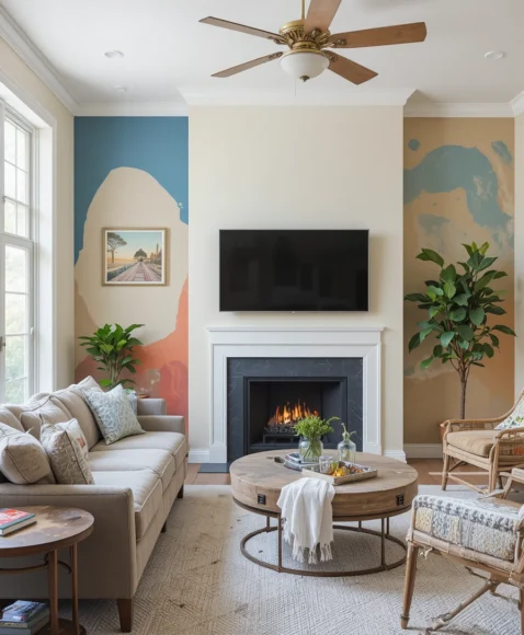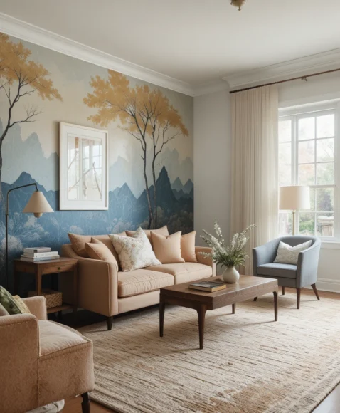 A mural instantly transforms your space into an artistic statement. Whether you choose abstract, botanical, or landscape designs, murals bring storytelling into the room. I often recommend murals for large, open walls that need personality. They’re perfect for making the living room feel unique and visually rich.