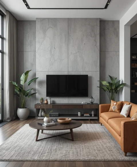 Concrete finish gives your living room a sleek, industrial feel without being cold. Faux concrete panels or textured paint can achieve the look easily. I like this idea for minimalist or modern interiors because it adds subtle depth. Pair it with warm furniture to balance the cool tone.