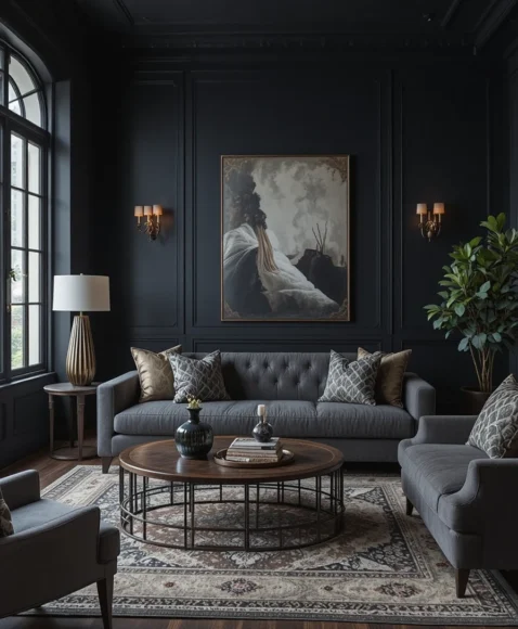 Deep shades like black, espresso, or midnight blue add dramatic sophistication. I often recommend moody walls for rooms that need contrast or depth. The key is pairing them with lighter décor to keep the space balanced. They make the living room feel elegant, intimate, and visually striking.