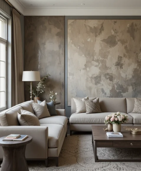 Plaster finishes add natural texture and depth, giving the wall a handcrafted look. It brings a Mediterranean, rustic, or earthy aesthetic into your living room. I love how plaster walls feel warm and organic, especially in neutral tones. Each stroke adds character you can’t get from flat paint.