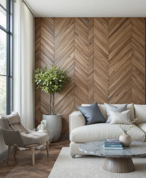Herringbone patterns instantly elevate the room with their architectural beauty. The zig-zag effect draws the eye and makes the wall feel dynamic. I recommend this if you want a refined, designer-approved look. Light wood creates an airy feel, while dark wood feels dramatic and elegant.
