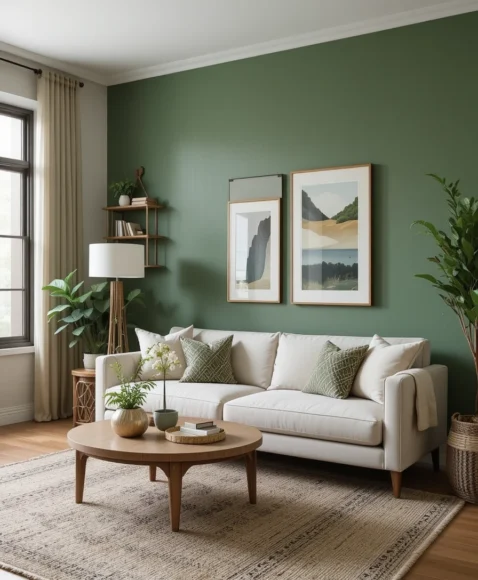 A green wall—painted or textured—brings calm, freshness, and harmony into your living room. It works beautifully with plants, wood décor, and natural fabrics. I enjoy how green anchors the room without overpowering it. Earthy tones like sage, olive, or moss create a peaceful, grounded atmosphere.