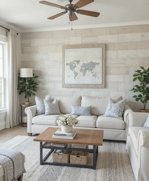 Shiplap adds texture and charm, making the living room feel warm and cozy. It works beautifully in farmhouse, cottage, or coastal-inspired spaces. I love pairing shiplap with soft neutrals for a relaxed vibe. Vertical shiplap makes the room appear taller, while horizontal lines add width.