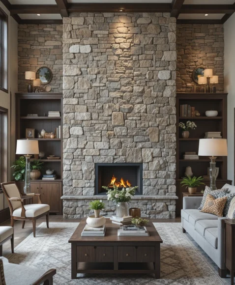 A stone wall gives the living room a luxurious, textural presence. Natural stone feels organic and grounding, while stone-look panels offer an affordable alternative. I always notice that stone walls instantly add drama without overpowering the space. They also pair beautifully with warm lighting and wood furniture.
