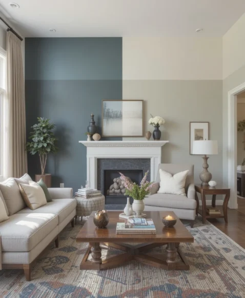 Color blocking uses multiple paint colors to create shapes or sections on the wall. It’s a fun and creative way to highlight your living room’s personality. I enjoy this approach for playful, modern, or artistic homes. It also helps frame key areas like reading corners or the TV unit.