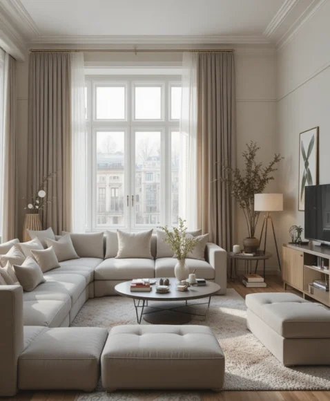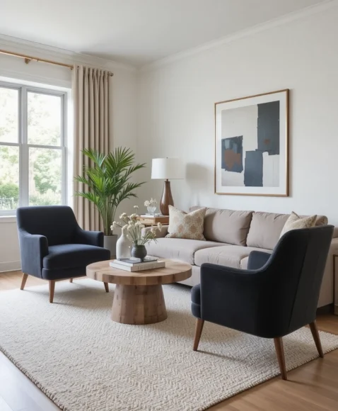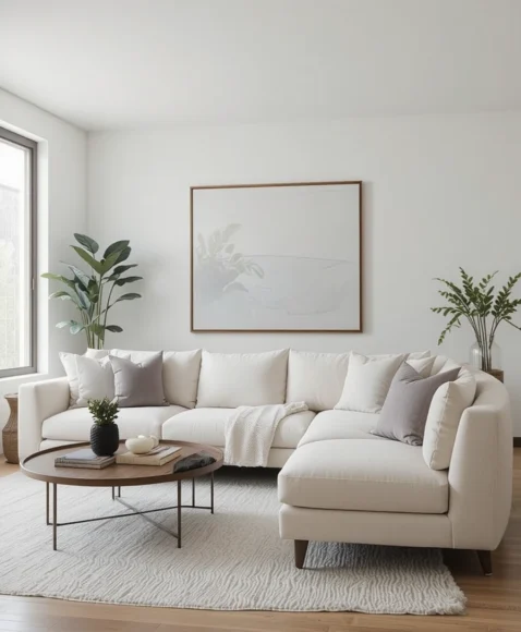 Select neutral upholstery for sofas and chairs, such as light gray, taupe, or soft ivory.