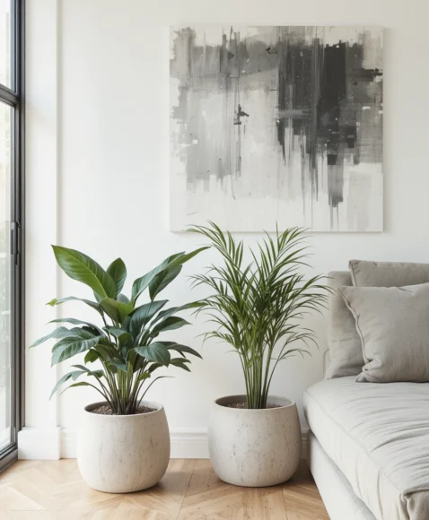 Add a touch of nature with large indoor plants, such as snake plants, fiddle leaf figs, or pothos.