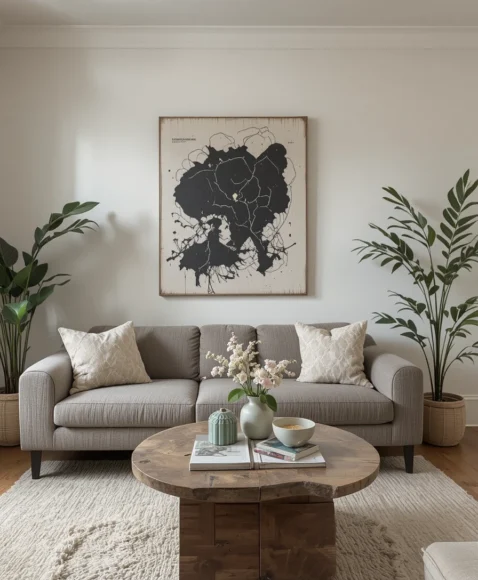 Choose artwork with clean, bold lines or abstract designs in neutral tones to complement the minimalist aesthetic.