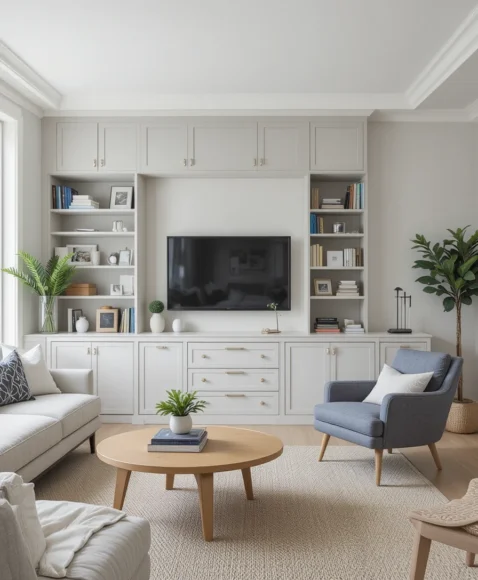 Custom cabinetry can be tailored to your living room’s specific needs, such as hidden compartments for electronics, books, or even extra seating.