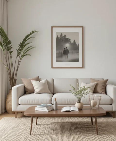Add personal touches to the minimalist living room with carefully selected wall art.