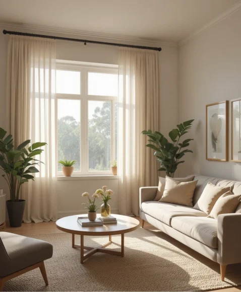 Instead of heavy drapes or ornate window coverings, opt for simplified window treatments like sheer curtains or minimalist blinds.