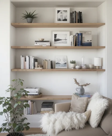Install simple wall shelves to display only essential items, such as books or decorative pieces.