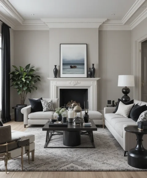 Black details like frames, tables, or lamps sharpen the moody feel. I love how black adds structure to a neutral palette. It highlights softer colors and creates balance. Even small touches make the room feel modern and intentional. It’s one of the simplest ways to enhance a moody design.