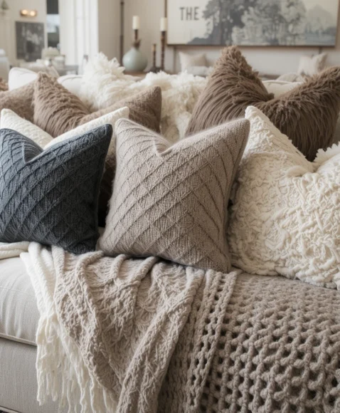 Throws and pillows are an easy way to build soft warmth. I like mixing cream, brown, and charcoal textiles. These layers add comfort without leaning on bold colors. Texture creates movement and depth. This approach makes the room feel inviting and easy to relax in.