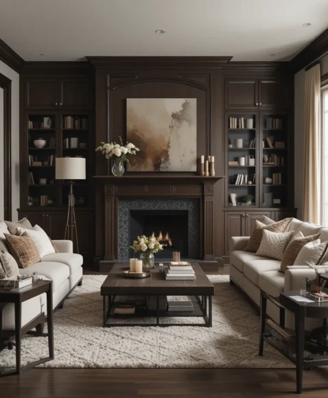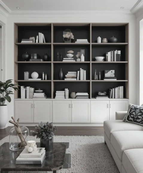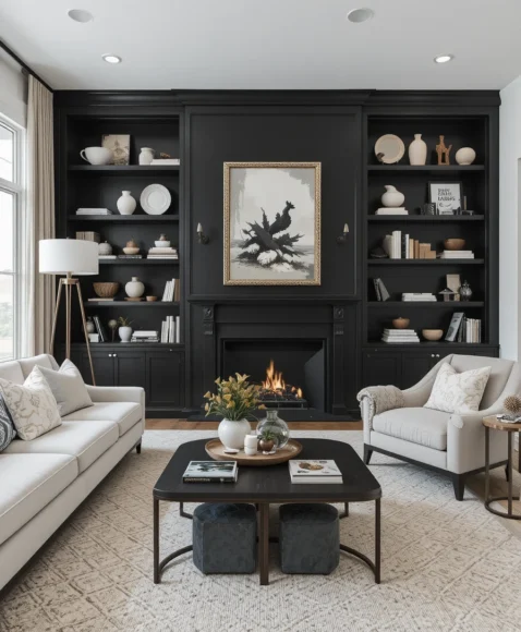 Dark built-ins add depth and a custom feel to the living room. I love styling them with neutral books, ceramics, and textured décor. These shelves become a sophisticated backdrop. They make the entire space feel curated. The contrast between the dark shelves and lighter décor keeps the room balanced.