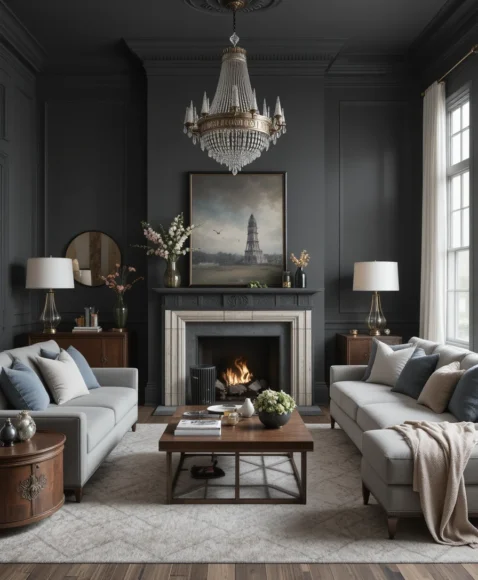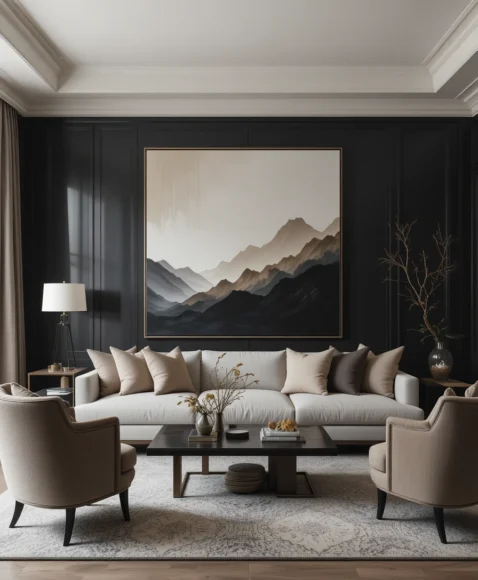 Taupe and mushroom tones add warmth while maintaining the moody aesthetic. I love how these colors mix easily with charcoal, brown, and black. They look luxurious but still soft and approachable. These shades are perfect for sofas and accent chairs. They make the room feel effortlessly chic.
