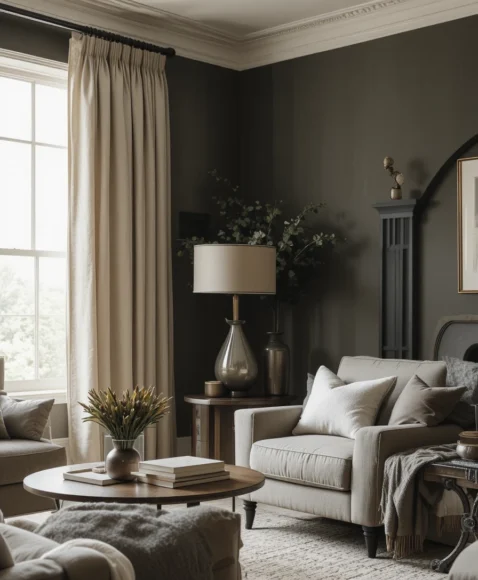 Curved furniture softens the edges of a moody room. I enjoy choosing cream or taupe curved sofas or chairs. These shapes feel soothing and modern. They balance the richness of darker tones around the room. Curves bring a gentle elegance that completes the space.