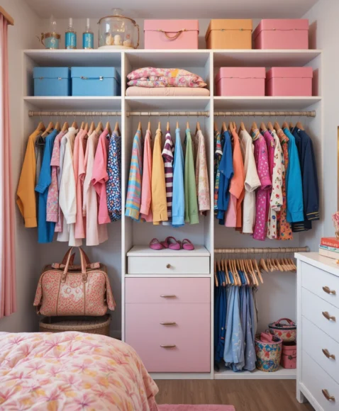 A well-organized closet with matching hangers, color-coordinated clothing, and labeled bins enhances your bedroom’s overall look. A tidy closet adds to the preppy feel and makes getting ready each day feel effortless and luxurious.