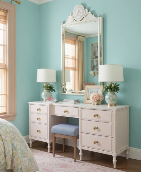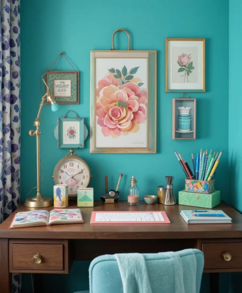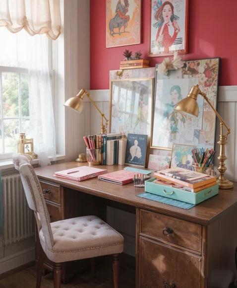 Using matching pens, notebooks, and desk organizers enhances the preppy feel of your workspace. Coordinated accessories show attention to detail, helping your desk area feel both stylish and functional. Even small details can make a huge difference in elevating the room.