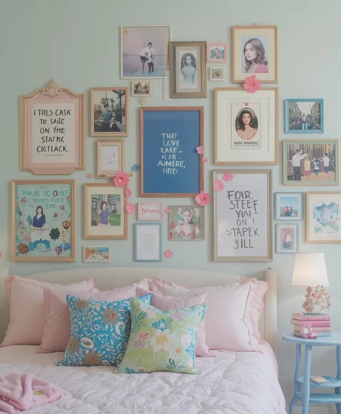 Create a gallery wall featuring framed personal photos, artwork, and inspirational quotes. Mixing frames of various sizes but keeping a cohesive color palette enhances the preppy aesthetic. This not only adds visual interest but also infuses your bedroom with personal stories and cherished memories.