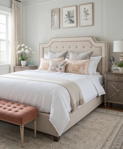 Investing in an upholstered headboard adds a soft, luxurious touch to any preppy bedroom. Neutral tones like beige, gray, or blush work well, while tufted designs enhance sophistication. This small upgrade can completely change the feel of your bed, making it the centerpiece of your room.