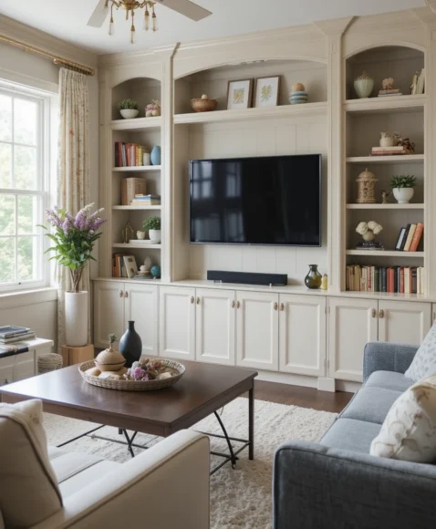 Built-ins make small living rooms feel polished and organized. Shelves around the TV or custom cabinets under windows provide hidden storage. I love how these built-ins keep everything tucked away, making the room feel larger and tidy.