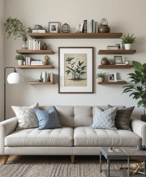 Floating shelves offer storage without taking up floor space. They’re perfect for displaying books, small plants, or decorative pieces. I love placing them above sofas or in small empty wall sections where other furniture won’t fit.
