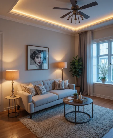 Lighting impacts mood more than we realize. Floor lamps, table lamps, and warm LED strips add layers of light that make your living room feel welcoming. I often mix a tall floor lamp with a few smaller sources so the room doesn’t rely on harsh ceiling lighting.