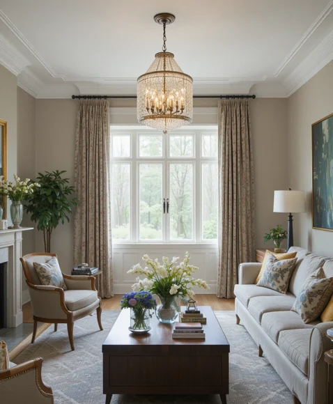 Even small rooms deserve a showpiece. A stylish chandelier or pendant light draws attention upward, creating height and character. I always pick lights with slim designs so they don’t overpower the room.