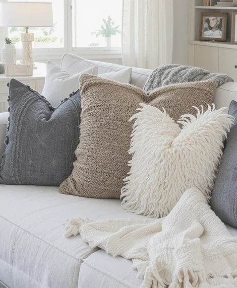 Cushions, throws, and textured pillows make your space feel comfortable without crowding it. I love mixing soft knits, velvets, and cotton fabrics—it adds depth while keeping the décor cozy. It’s also an easy way to update the room each season.